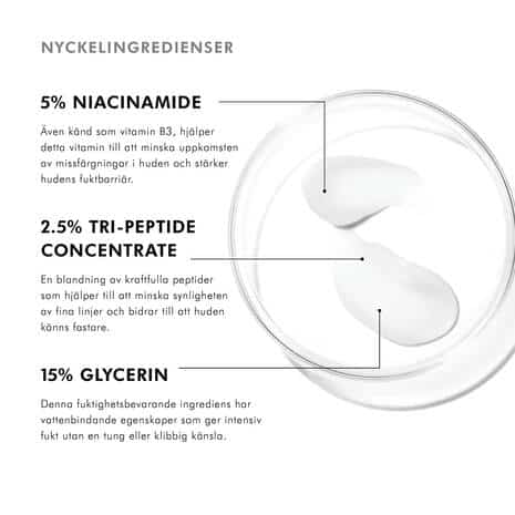 Med 5 % niacinamid (vitamin B3) stimulerar krämen hudens naturliga cellförnyelse, jämnar ut hudtonen och minskar synligheten av fina linjer och åldersfläckar. Den stärker även hudens skyddsbarriär tack vare en kombination av ceramider och lipider, som skyddar mot uttorkning och yttre påfrestningar.