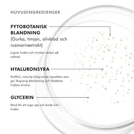 Blandning av extrakt av boldoblad, gurka, timjan, olivblad och rosmarin.Blandning av hyaluronsyra + glycerin